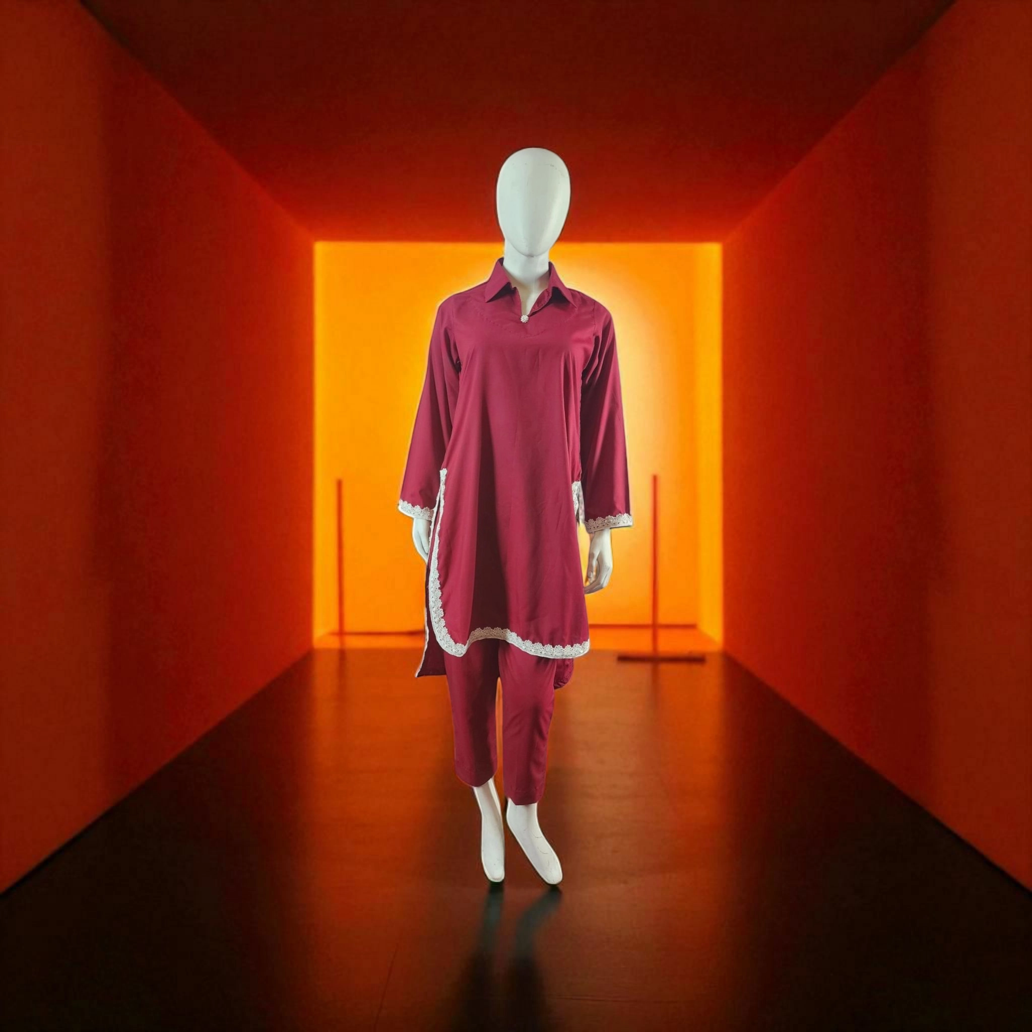 A masterpiece of refined charm, Gul-e-Mahroon speaks the language of understated elegance. Crafted from premium lawn, the smart collared neckline with a front placket is subtly adorned by a single white pearl button, offering a clean, polished finish that captures the eye with quiet sophistication. The true highlight lies in the delicate white GPO lace gracefully tracing the sleeves and hemline, adding a whisper of intricate artistry.