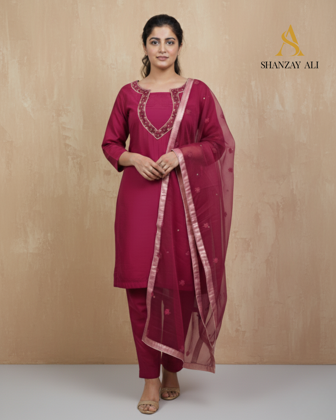 Step into the heart of winter luxury with Shanzay Ali’s Winter Collection Vol. 1 and the Maroon Majesty, a breathtaking three-piece ethnic suit priced at Rs 6,500. This ensemble embodies regal sophistication, crafted from rich maroon raw silk that cascades with a refined, luxurious drape, perfect for those who command attention at weddings, mehndi celebrations, or upscale winter gatherings. Inspired by the deep hues of a royal twilight, this outfit fuses traditional handwork with a modern, clean aesthetic, offering a harmonious balance of heritage and contemporary flair that elevates your presence with every step.