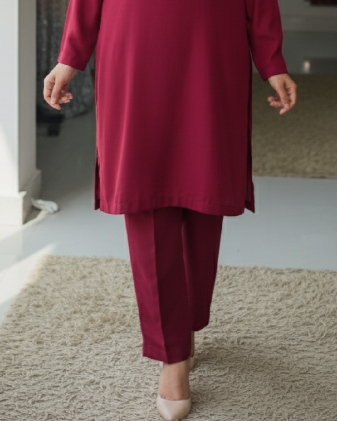 - Trousers: Coordinated raw silk trousers in the same rich maroon hue offer a seamless, sophisticated silhouette. Their tailored fit ensures a fluid yet structured look, providing comfort and a polished finish that complements the kurta’s grandeur—ideal for long festive hours.