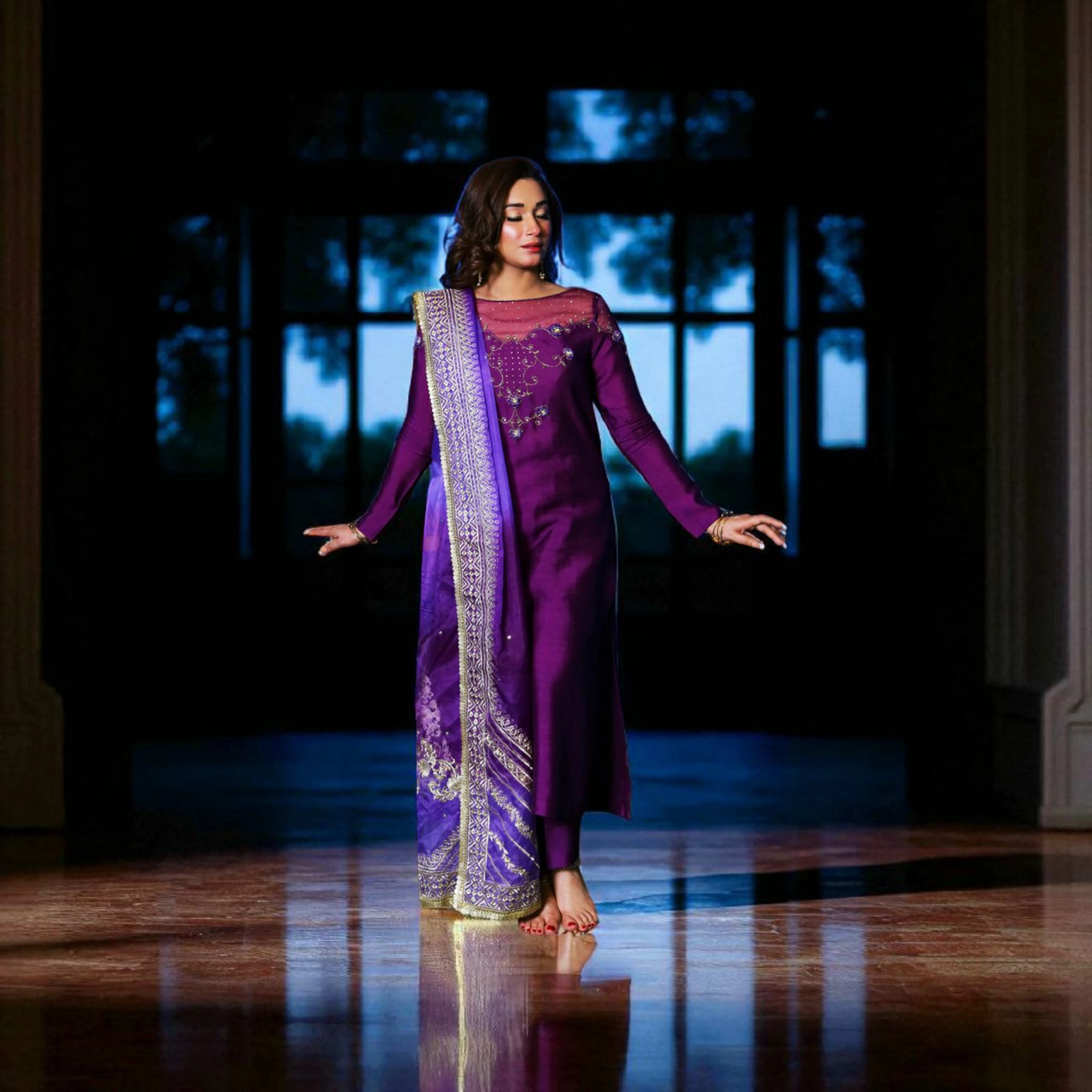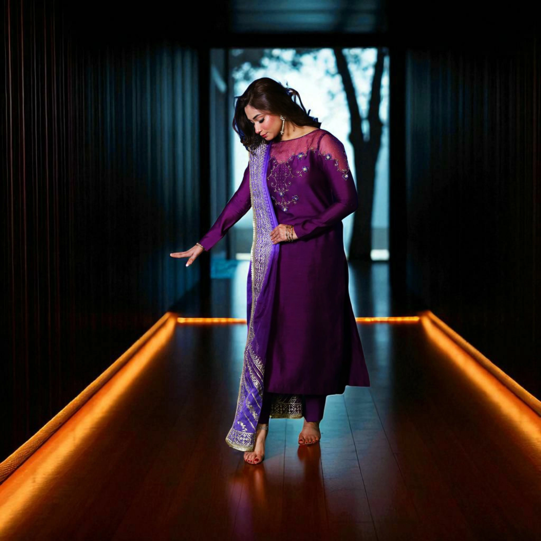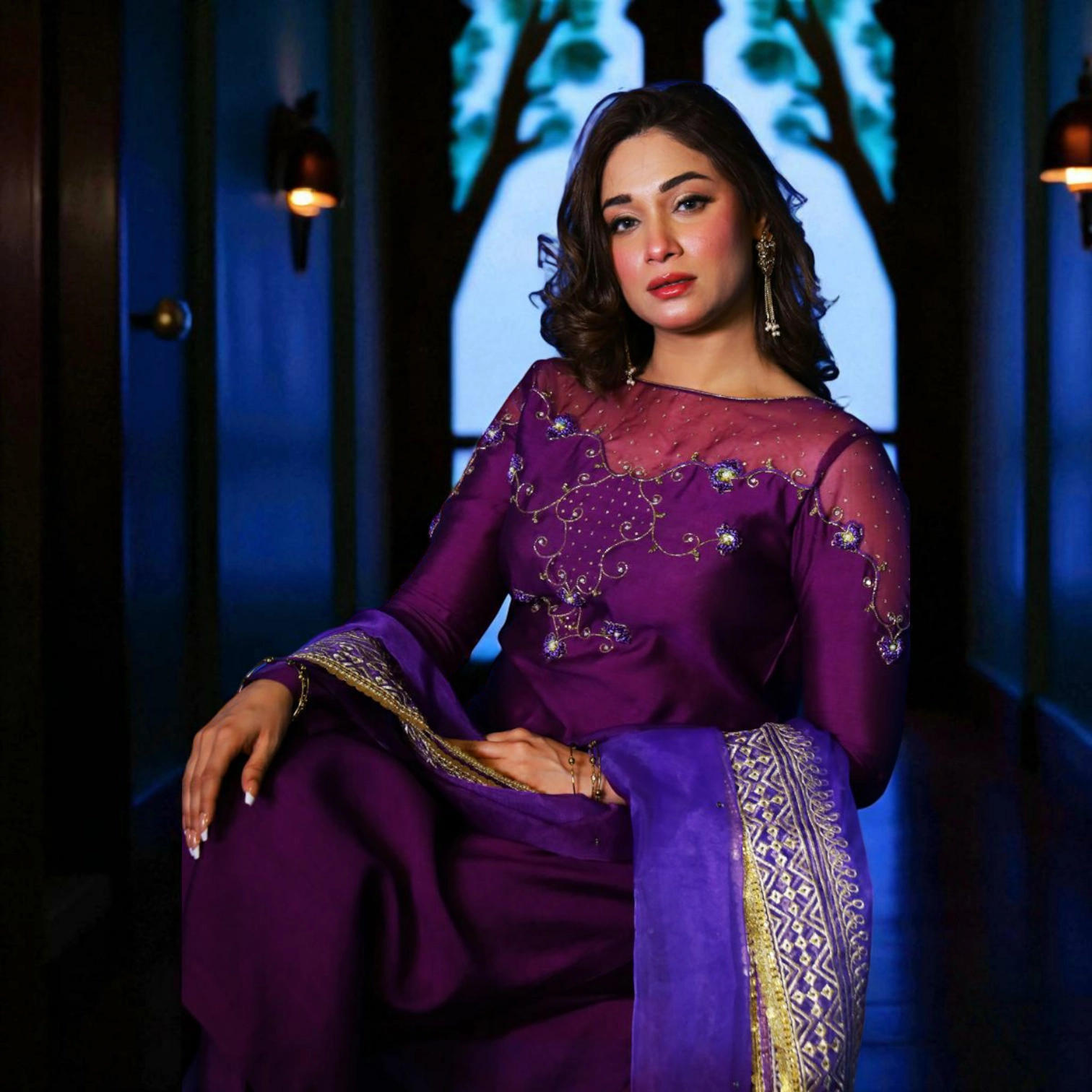- Stitched 3-piece luxury formal in deep purple-indigo tones