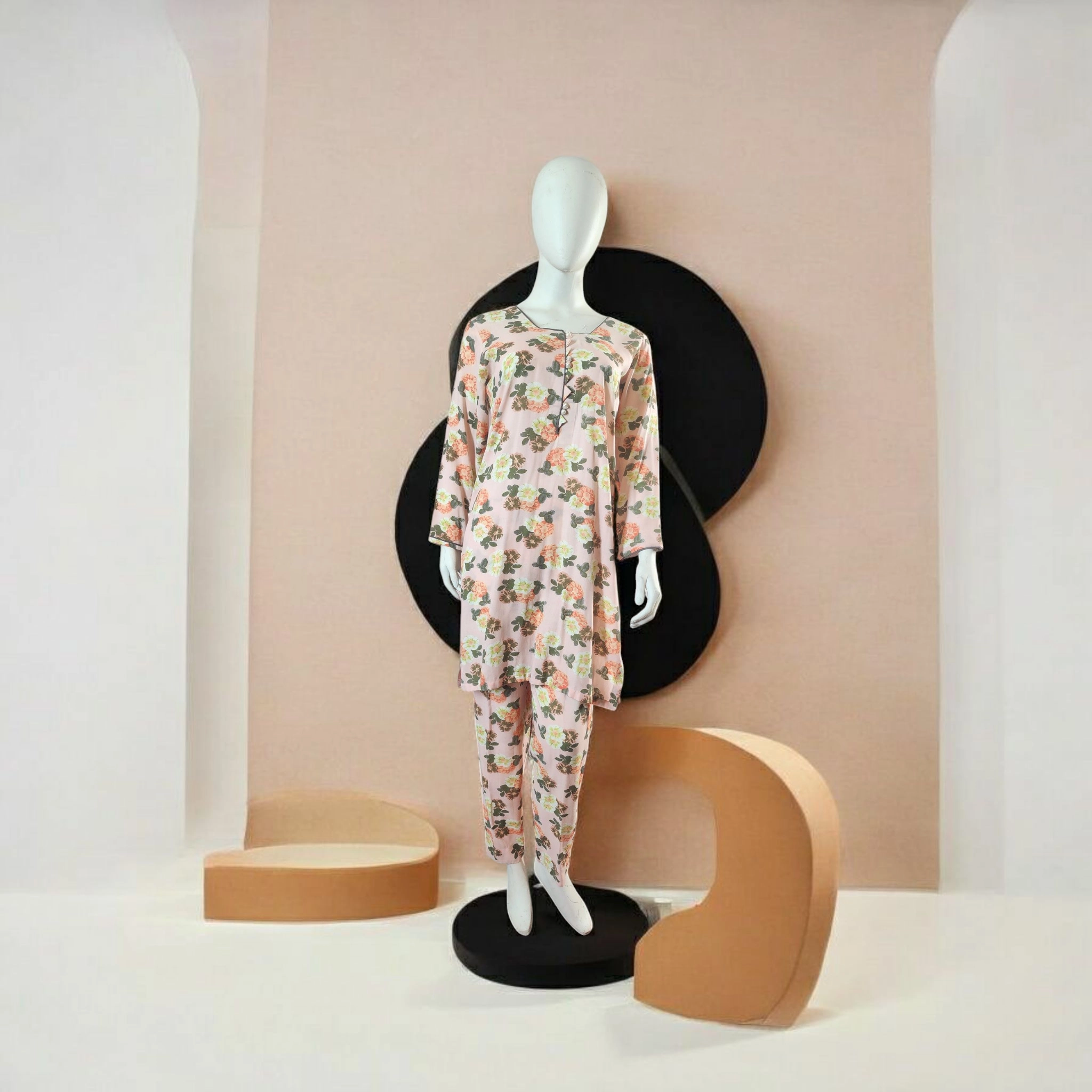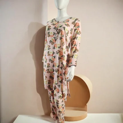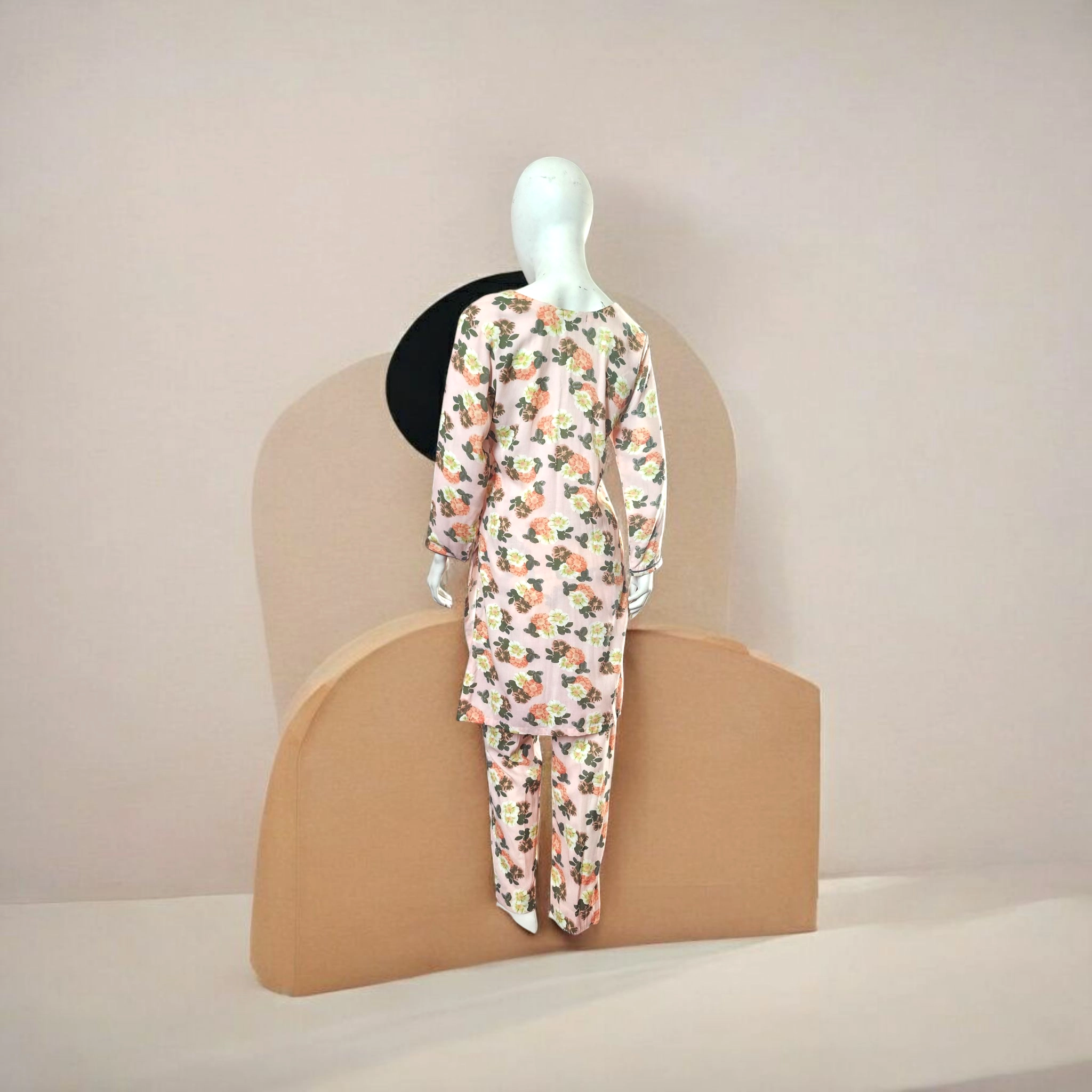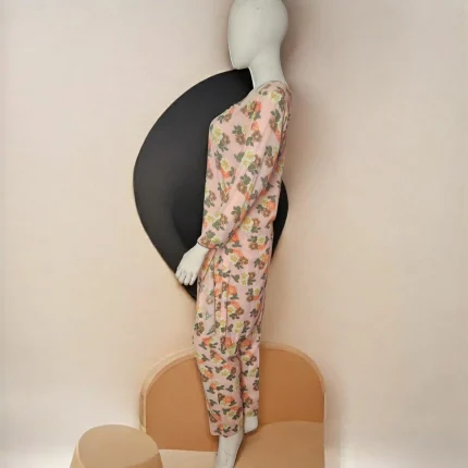 A portrait of calm and charm, Rang-e-Subah embodies the softness of a pastel morning. This two-piece suit in soft pink linen is a gentle ode to summer—lightweight, breathable, and effortlessly graceful. A delicate floral print in tones of green, orange, and peach dances across the shirt and matching trouser, evoking a garden kissed by the sun.
