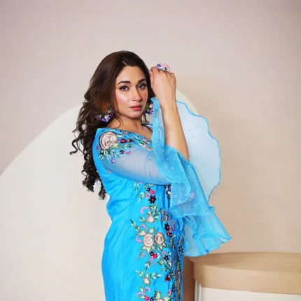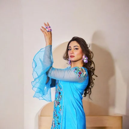 Safa-e-Aasman is a poetic portrayal of serenity, wrapped in the cool embrace of sky blue. This two-piece ensemble is a refined expression of tradition reimagined, featuring a gracefully asymmetrical khaddi cotton shirt, adorned with multicolored floral threadwork. Organza bell sleeves embellished with delicate pearl beads elevate its elegance, while the classic straight pants complete the look with tailored perfection. Light yet regal, it’s an ideal pick for festive daytime celebrations and sophisticated soirées alike.