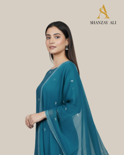 Immerse yourself in the serene allure of Shanzay Ali’s Winter Collection Vol. 1 with the Teal Dream, a three-piece ethnic suit that redefines subtle sophistication for the modern woman. Priced at Rs 6,800, this captivating ensemble whispers of tranquil oceans and twilight skies, blending luxurious fabrics with artisanal finesse to create an understated elegance that’s perfect for mehndi ceremonies, winter soirees, or casual elegance. Every element is meticulously crafted to drape with effortless poise, ensuring you move through the season with a quiet confidence that turns heads without a word.