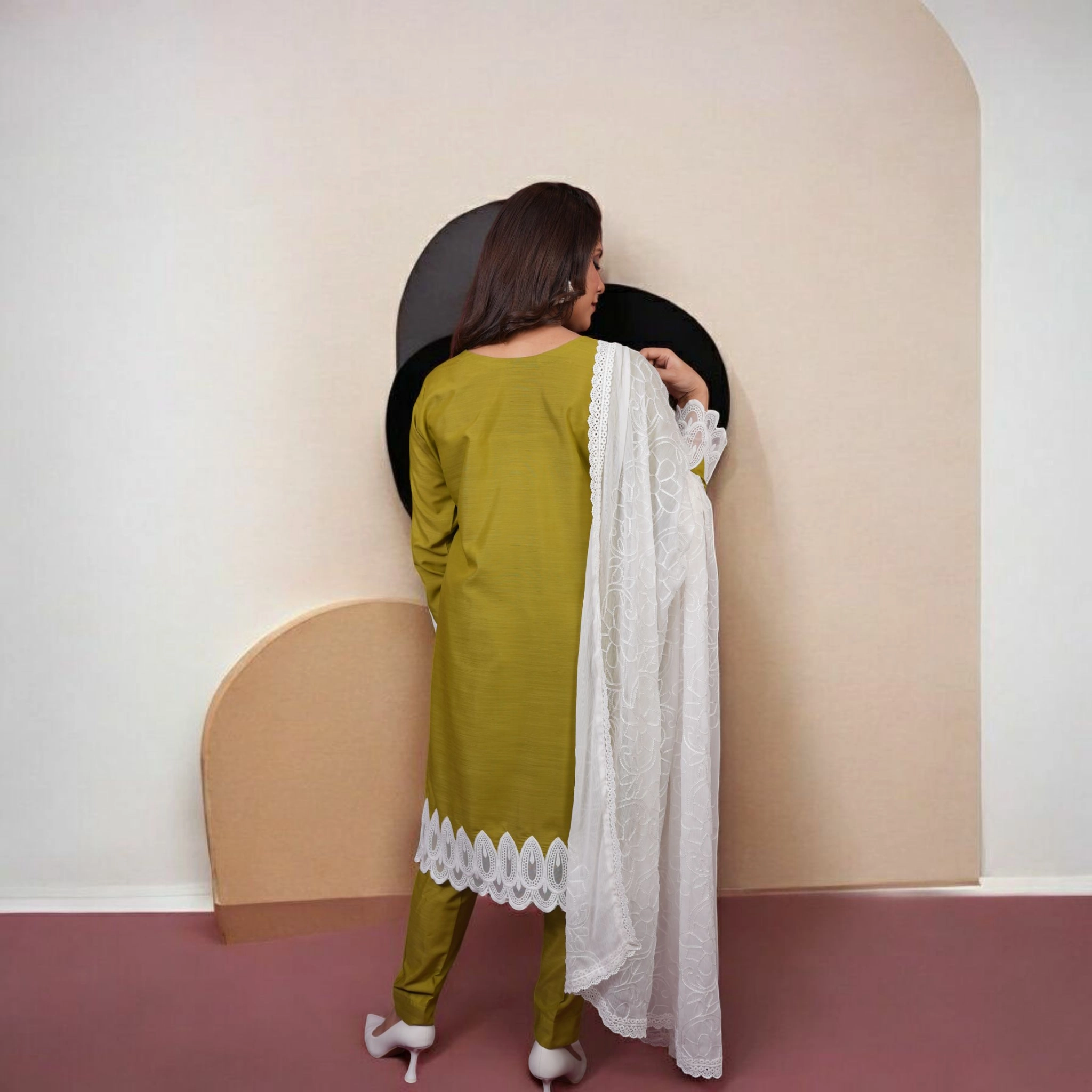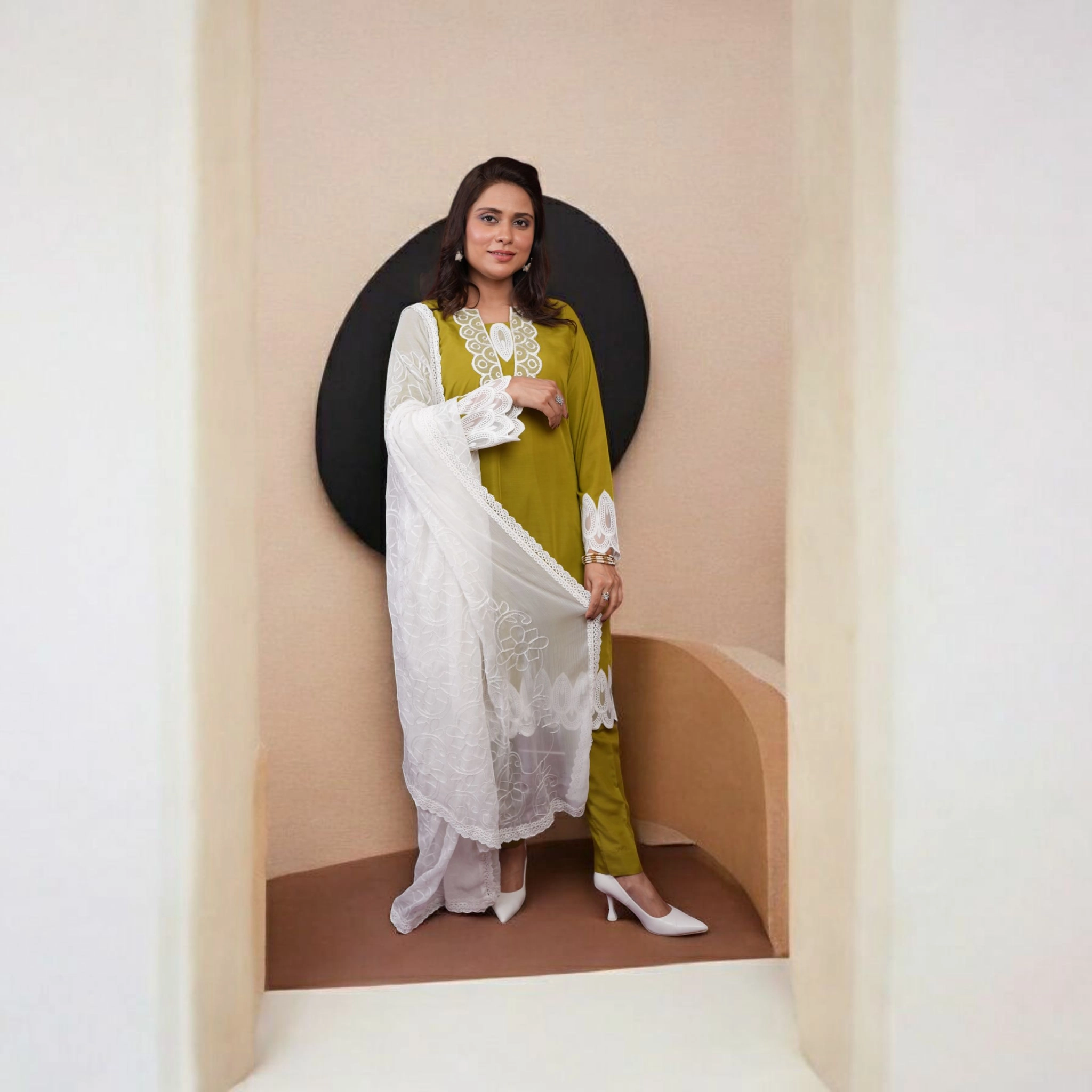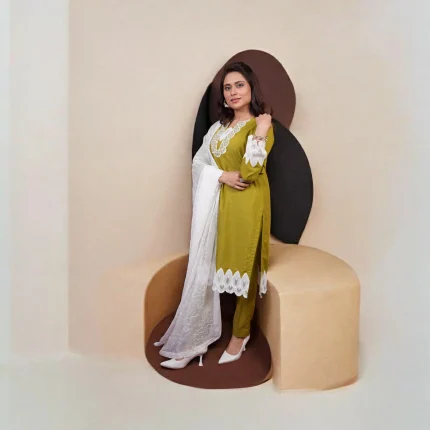 Subtle yet striking, Zaitooni Nazakat is a graceful olive green 3-piece ensemble that seamlessly blends tradition with contemporary finesse. Crafted in breathable raw silk, the shirt features exquisite white lace embroidery along the neckline, sleeves, and hem — accentuated by a deep V-shaped motif that adds a regal aura. Paired with matching trousers and a lightweight georgette dupatta, this ensemble is a refined choice for festive affairs and elegant daywear.