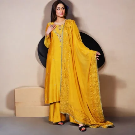 Zard-e-Gul is a radiant ode to contemporary grace, blending traditional craftsmanship with modern charm. The khaadi net shirt, delicately embroidered with intricate machine work, forms the heart of this vibrant ensemble. A flowy chiffon dupatta, adorned with elegant embroidery, adds a breezy allure, while the stylish bell bottom pants complete the look with a chic, updated silhouette. This 3-piece stitched outfit is designed for those who love to make a statement—elegantly and effortlessly.